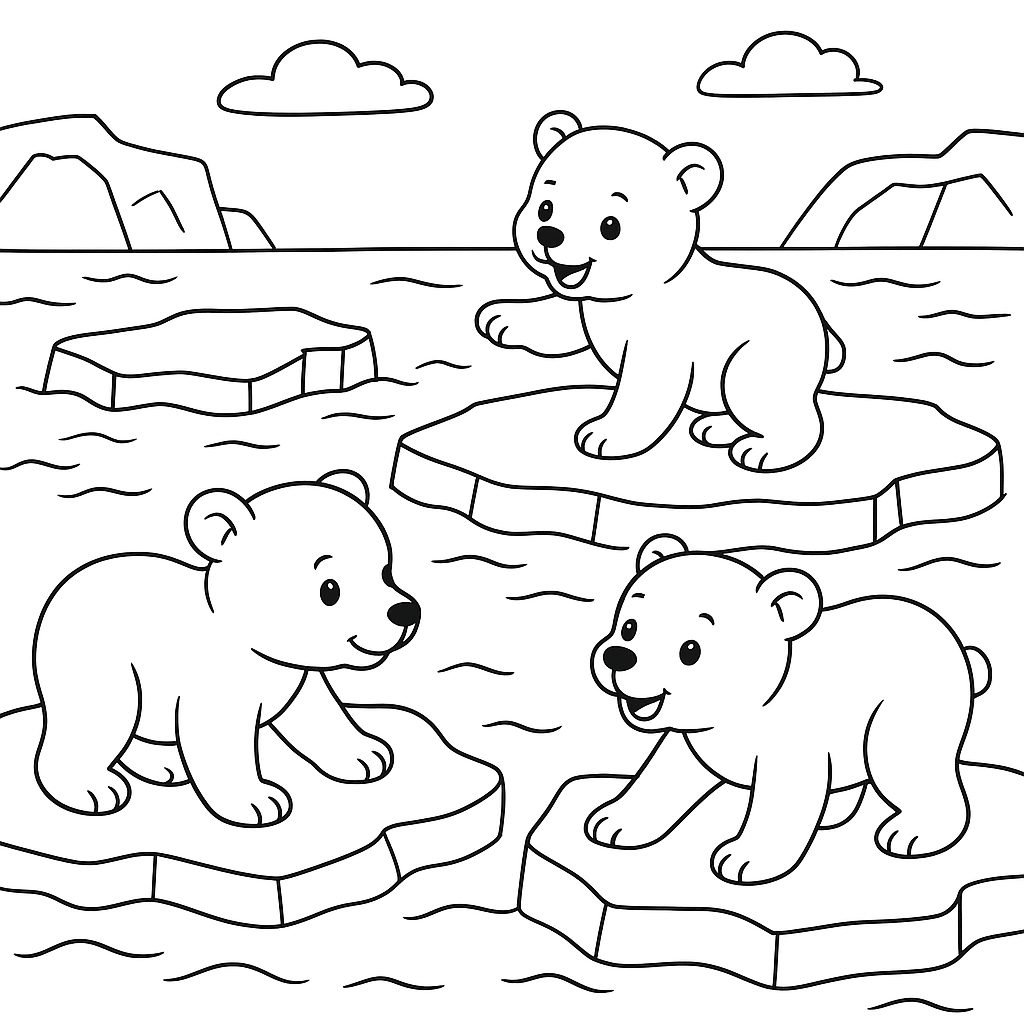 A medium coloring page featuring polar bear cubs playing on melting ice floes. Perfect for kids (6-9) with moderately detailed outlines for a fun coloring experience.