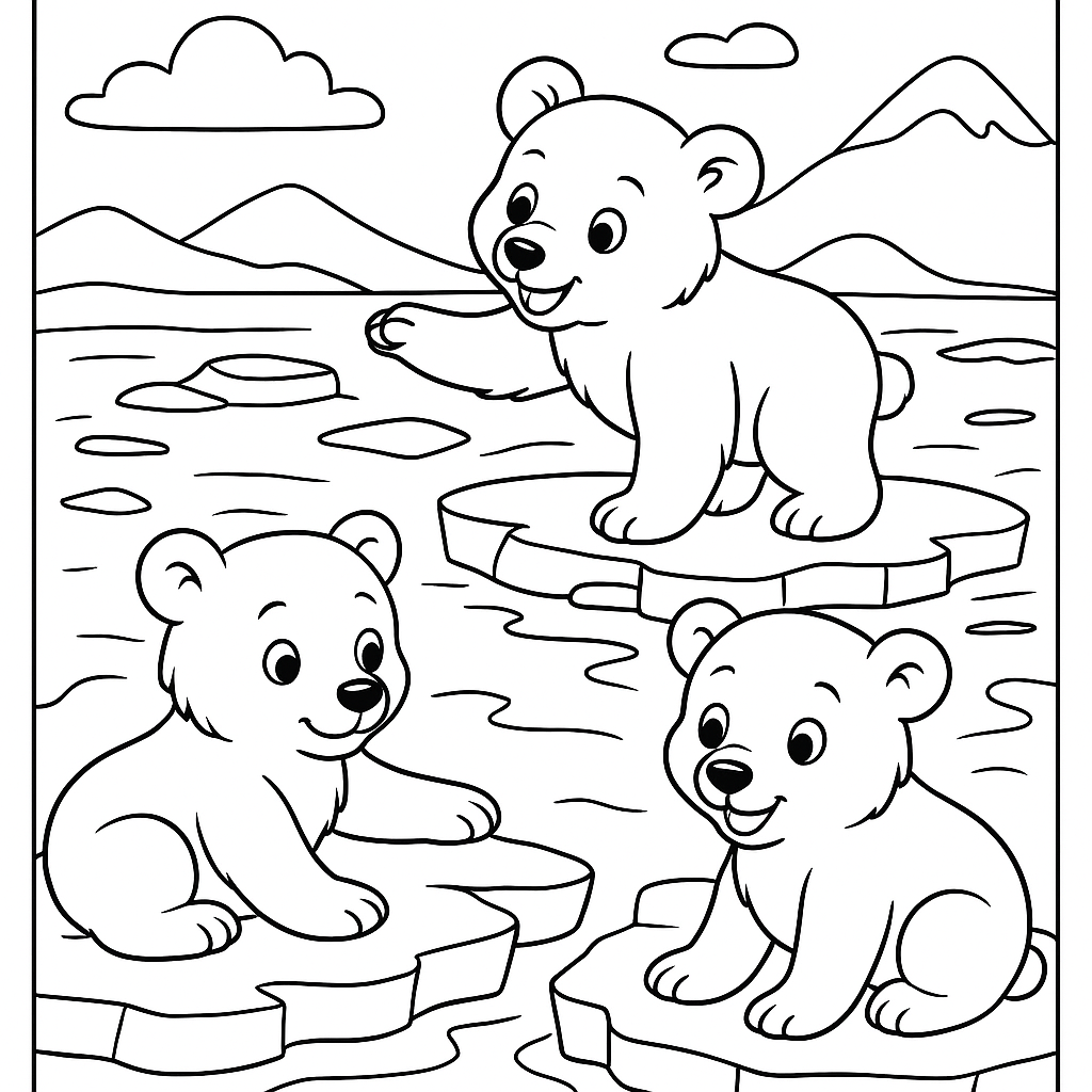 A medium coloring page featuring polar bear cubs playing on melting ice. Perfect for kids (6-9) with moderately detailed outlines for a fun coloring experience.