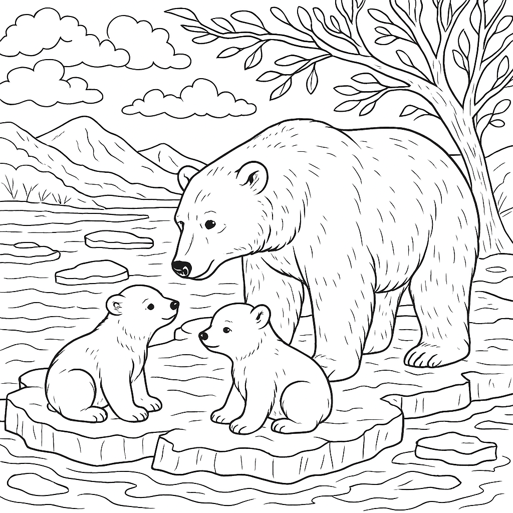 A detailed coloring page featuring polar bear with cubs on melting ice in spring. Perfect for tweens (9-12) with intricate detail for a fun coloring experience.