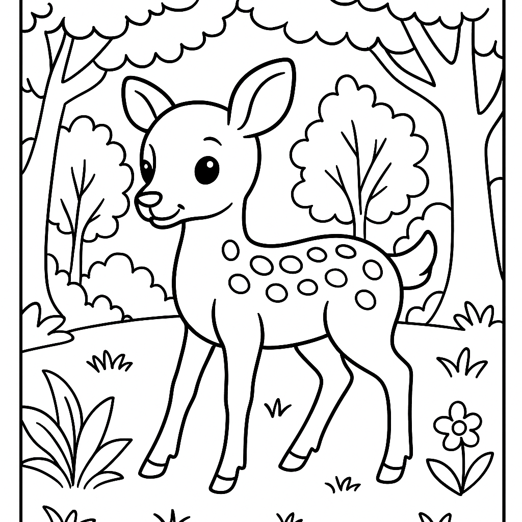 A medium coloring page featuring a baby deer fawn with spotted coat in forest clearing. Perfect for kids (4-6) with moderately detailed outlines for a fun coloring experience.