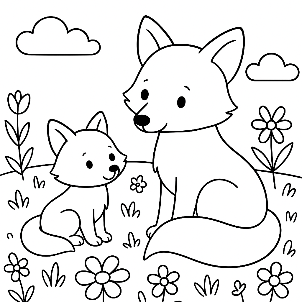 A simple coloring page featuring a baby fox with its mother in a spring flower meadow. Perfect for kids (4-6) with large, bold outlines for a fun coloring experience.