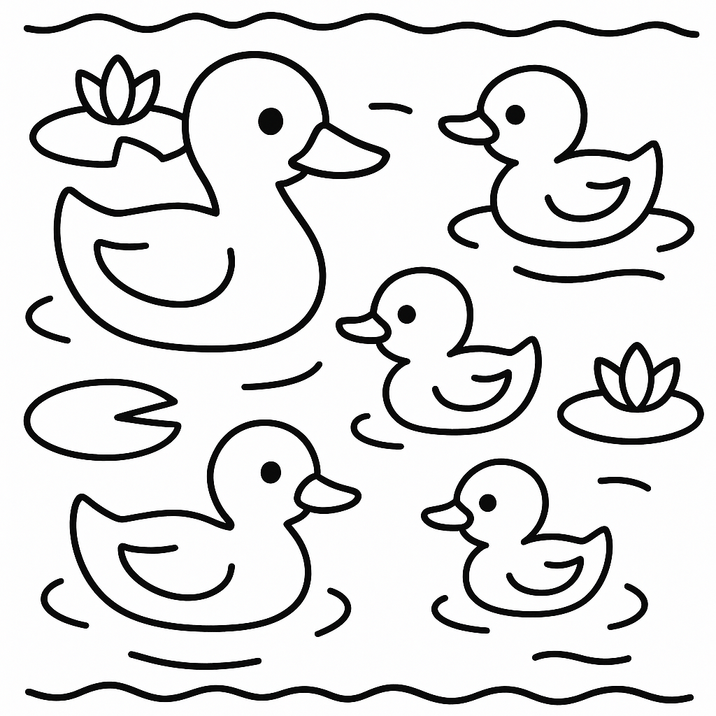 A simple coloring page featuring a duckling family swimming in a pond with lily pads. Perfect for toddlers (2-4) with large, bold outlines for a fun coloring experience.