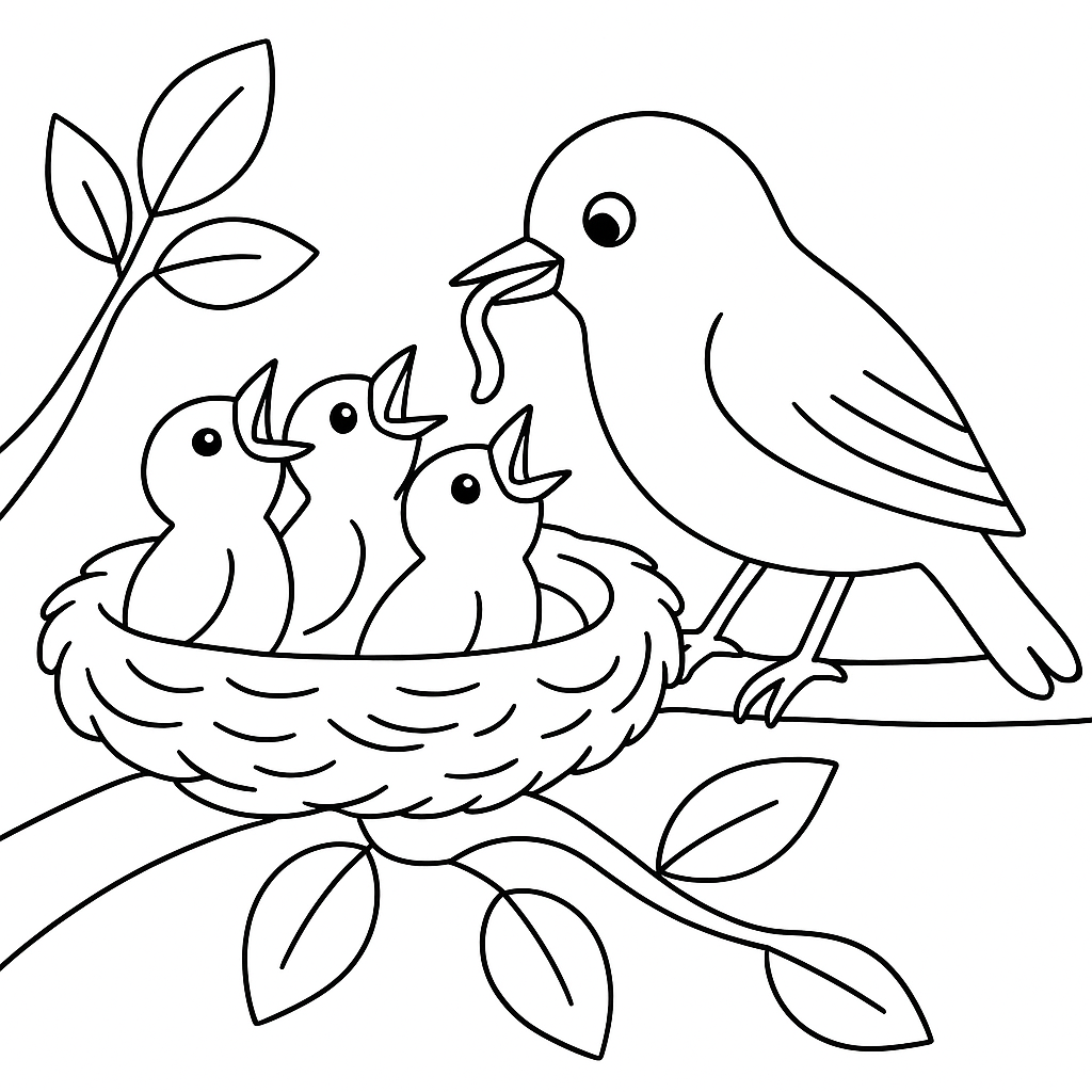 A simple coloring page featuring a nest of baby robins with their mother feeding them. Perfect for kids (4-6) with large, bold outlines for a fun coloring experience.