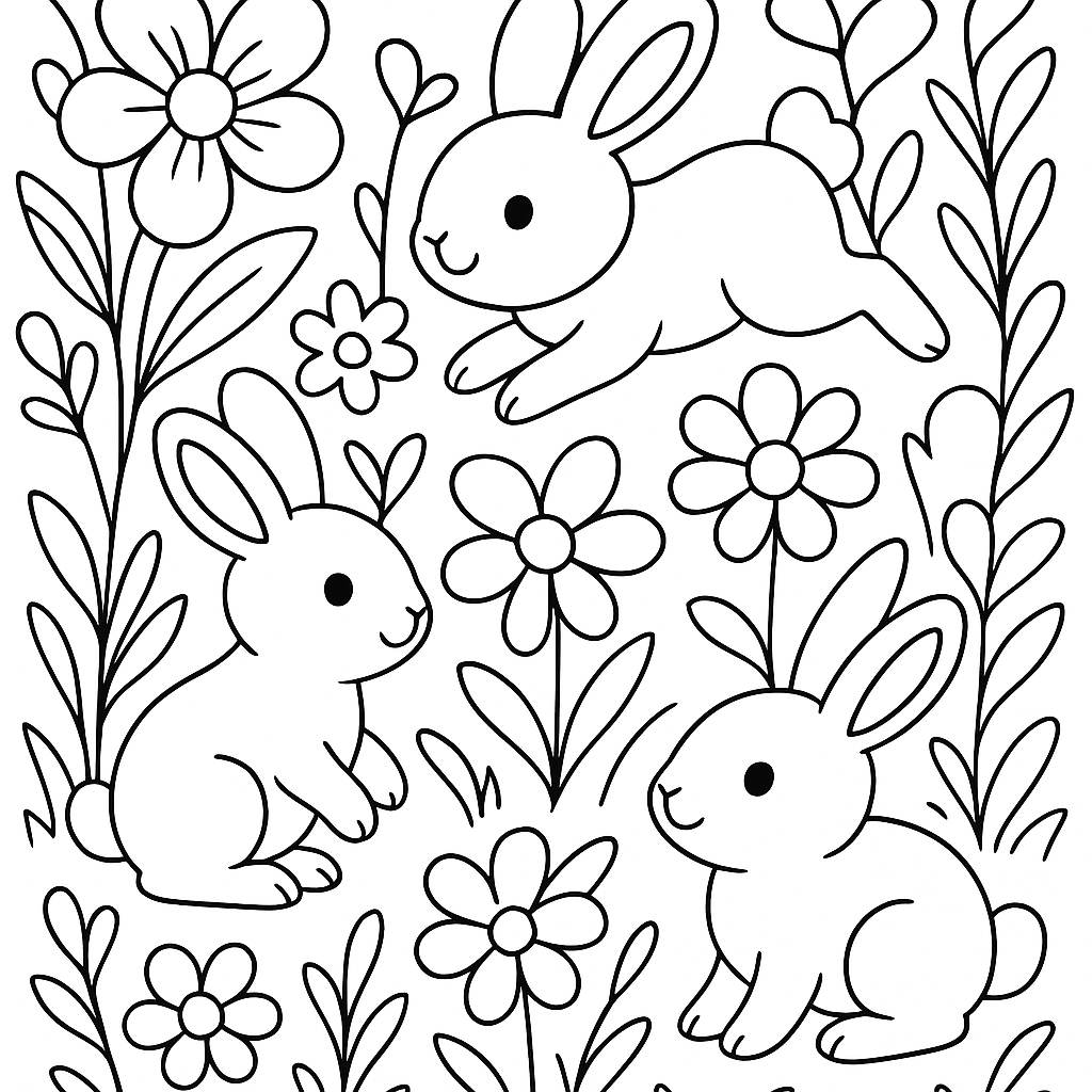 A simple coloring page featuring baby bunnies playing in a flower garden. Perfect for toddlers (2-4) with large, bold outlines for a fun coloring experience.