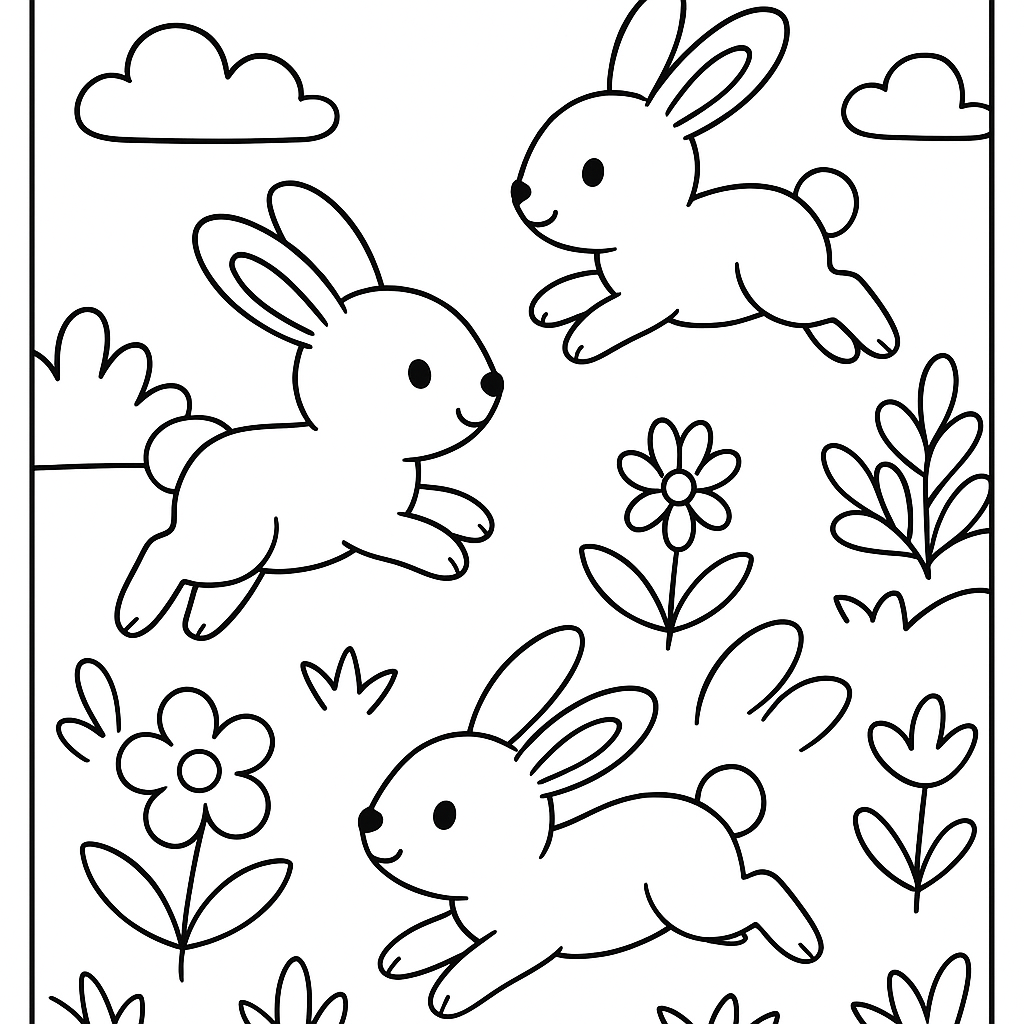 A simple coloring page featuring baby rabbits hopping through a garden. Perfect for toddlers (2-4) with large, bold outlines for a fun coloring experience.