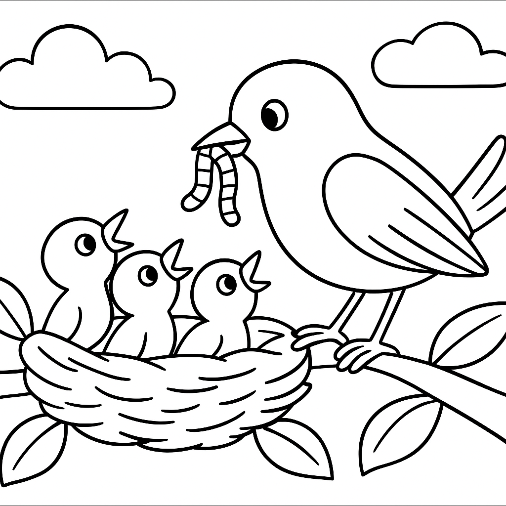 A simple coloring page featuring baby robins in a nest with their mother bringing worms. Perfect for kids (4-6) with large, bold outlines for a fun coloring experience.
