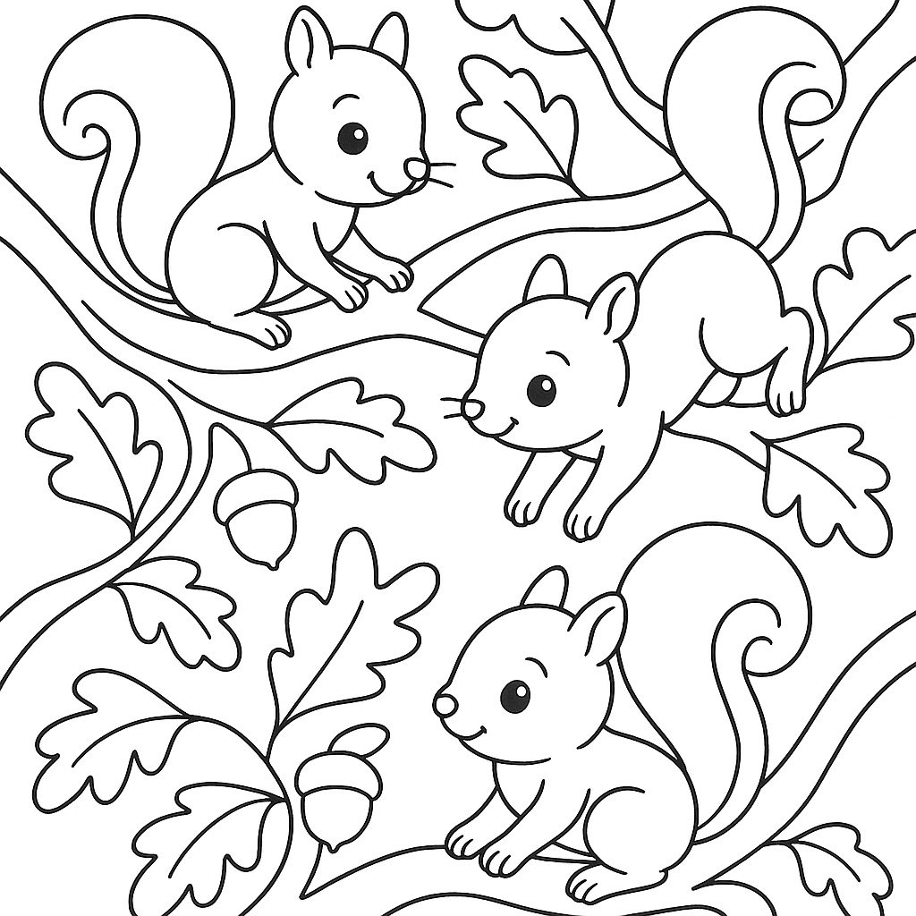 A simple coloring page featuring baby squirrels playing in oak tree branches. Perfect for kids (4-6) with large, bold outlines for a fun coloring experience.