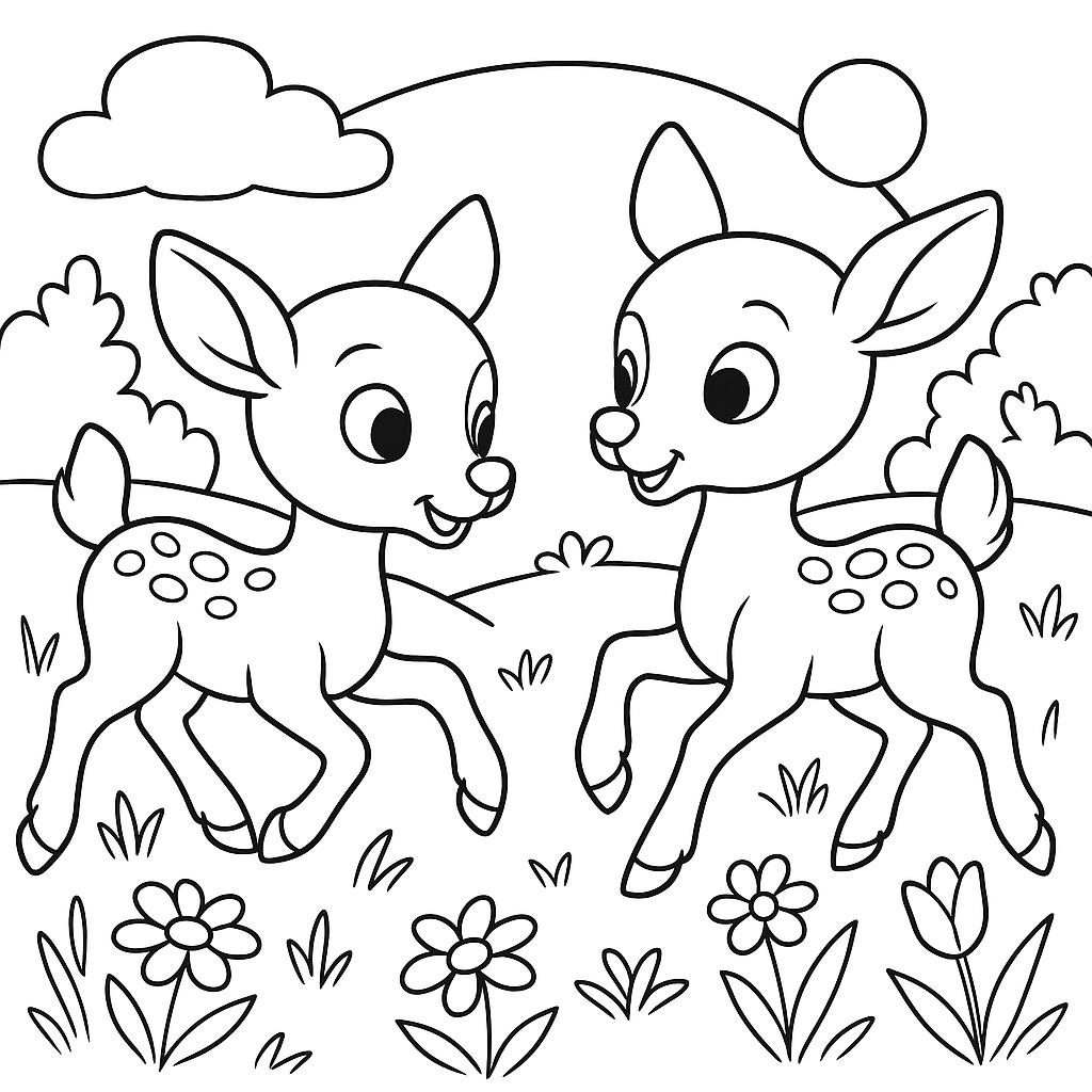 A medium coloring page featuring twin baby deer frolicking in a meadow. Perfect for kids (6-9) with moderately detailed outlines for a fun coloring experience.