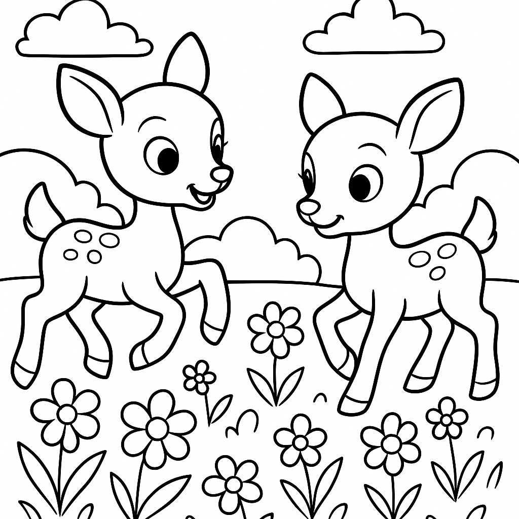 A simple coloring page featuring twin baby deer playing in spring flowers. Perfect for kids (4-6) with large, bold outlines for a fun coloring experience.