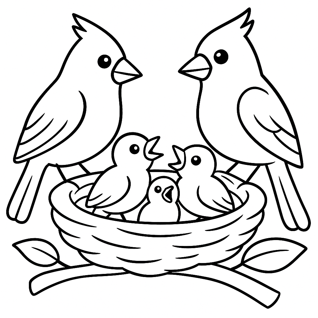 A simple coloring page featuring a cardinal family with baby birds in nest. Perfect for kids (4-6) with large, bold outlines for a fun coloring experience.