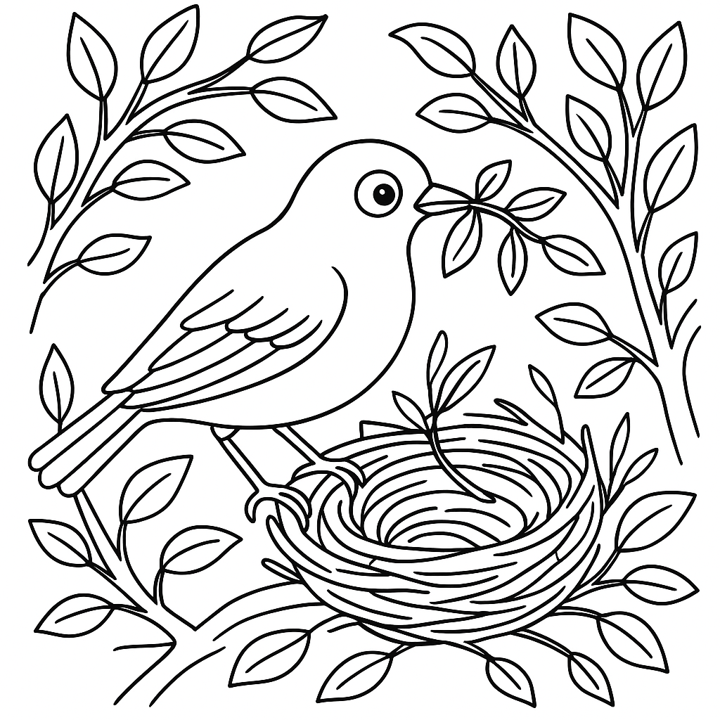 A detailed coloring page featuring a robin building nest with twigs and leaves. Perfect for kids (6-9) with intricate detail for a fun coloring experience.