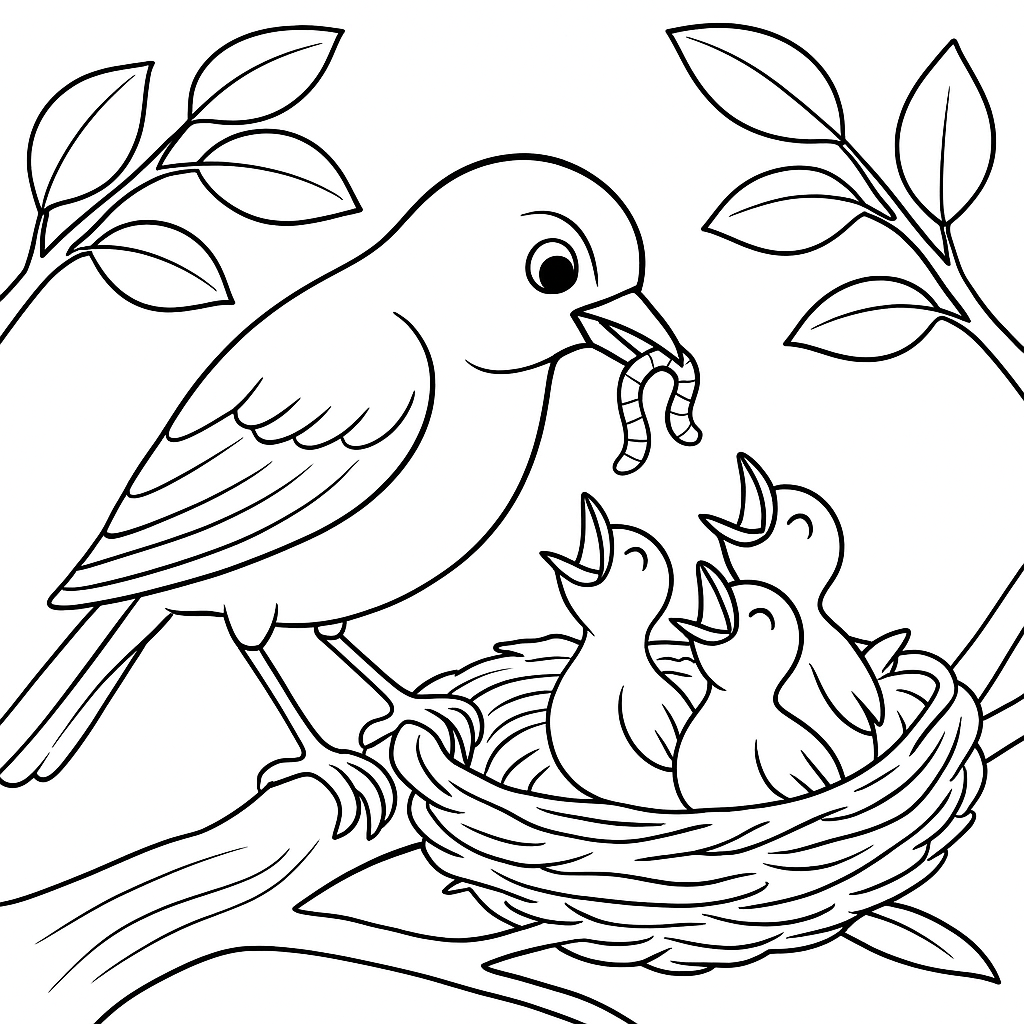 A medium coloring page featuring a robin feeding worms to baby birds in a nest. Perfect for kids (6-9) with moderately detailed outlines for a fun coloring experience.