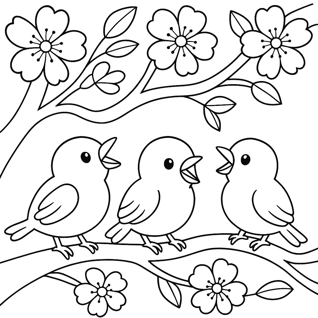 A simple coloring page featuring baby birds chirping in a cherry blossom tree. Perfect for kids (4-6) with large, bold outlines for a fun coloring experience.