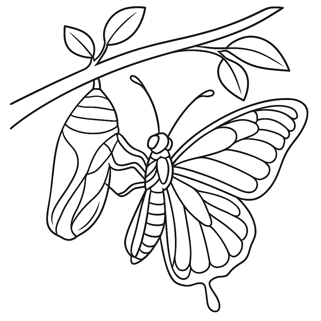A medium coloring page featuring a butterfly emerging from its chrysalis. Perfect for kids (6-9) with moderately detailed outlines for a fun coloring experience.