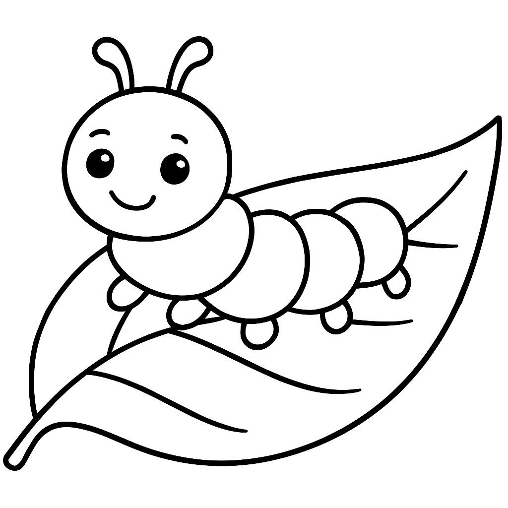A simple coloring page featuring a caterpillar crawling on a fresh green leaf. Perfect for toddlers (2-4) with large, bold outlines for a fun coloring experience.
