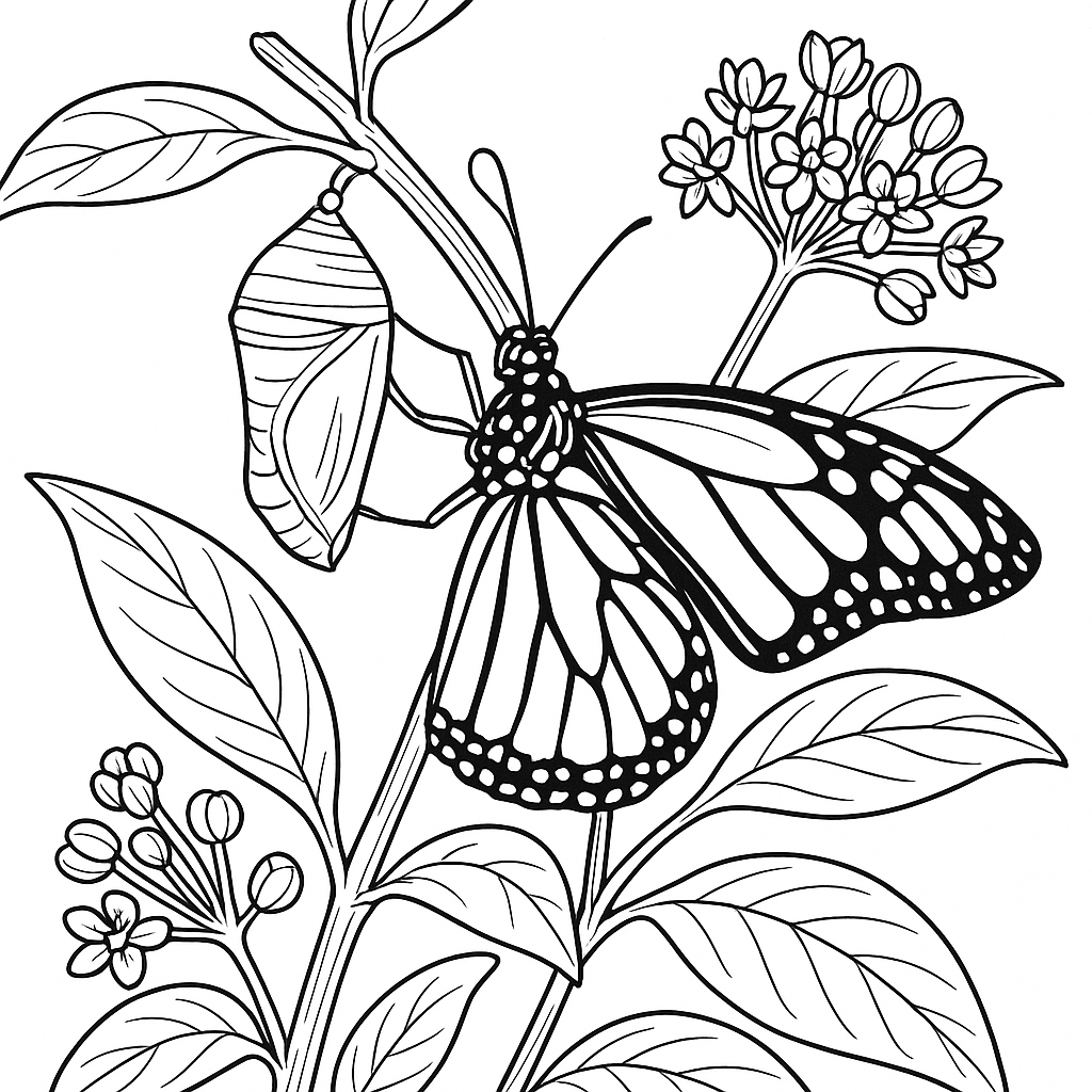 A detailed coloring page featuring a detailed butterfly emerging from its chrysalis on a milkweed plant. Perfect for tweens (9-12) with intricate detail for a fun coloring experience.