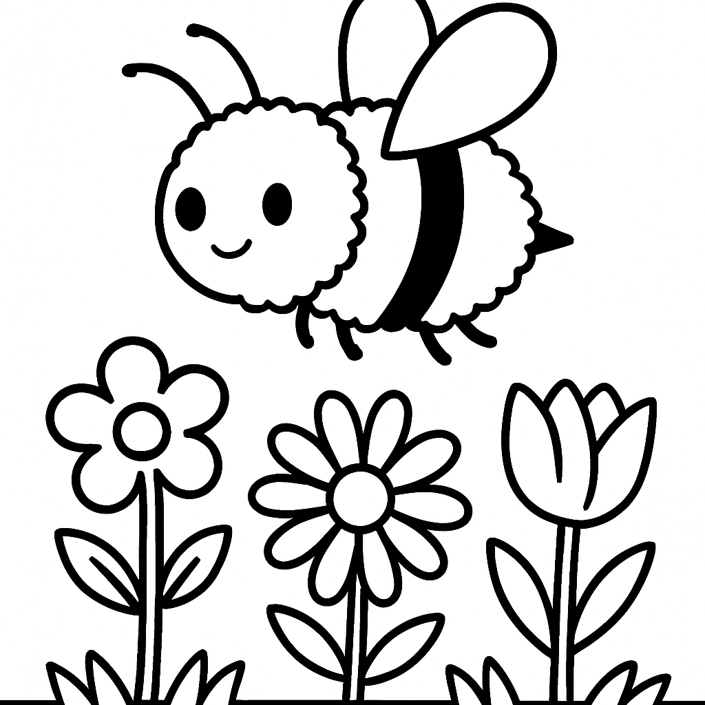 A simple coloring page featuring a fuzzy bumblebee hovering over a meadow of wildflowers gathering pollen. Perfect for kids (4-6) with large, bold outlines for a fun coloring experience.