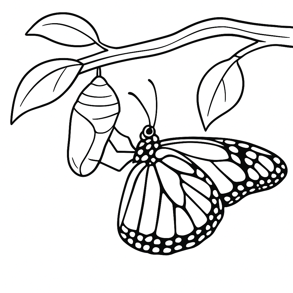A medium coloring page featuring a monarch butterfly emerging from chrysalis. Perfect for kids (6-9) with moderately detailed outlines for a fun coloring experience.