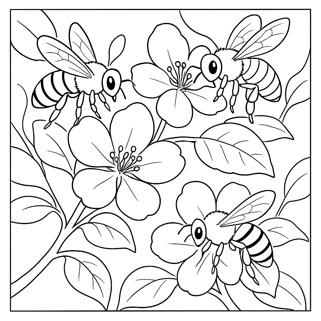 A medium coloring page featuring bees collecting nectar from apple blossoms. Perfect for kids (6-9) with moderately detailed outlines for a fun coloring experience.
