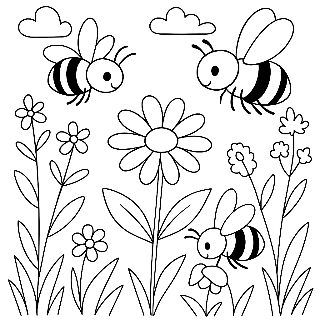 A simple coloring page featuring bees collecting nectar from spring wildflowers. Perfect for kids (4-6) with large, bold outlines for a fun coloring experience.