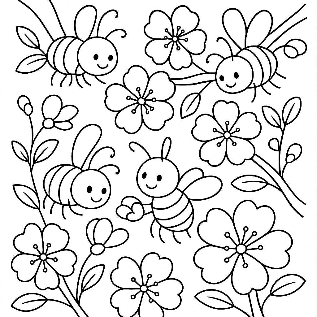 A medium coloring page featuring busy bees collecting nectar from cherry blossoms. Perfect for kids (4-6) with moderately detailed outlines for a fun coloring experience.