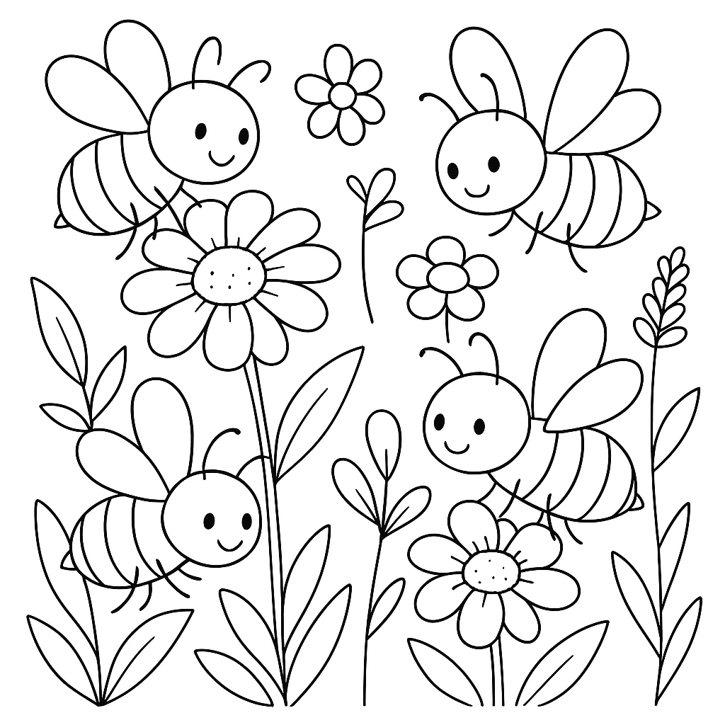 A simple coloring page featuring busy bees collecting nectar from wildflowers. Perfect for kids (4-6) with large, bold outlines for a fun coloring experience.