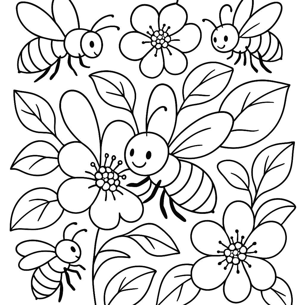 A medium coloring page featuring busy bees collecting pollen from apple blossoms. Perfect for kids (4-6) with moderately detailed outlines for a fun coloring experience.