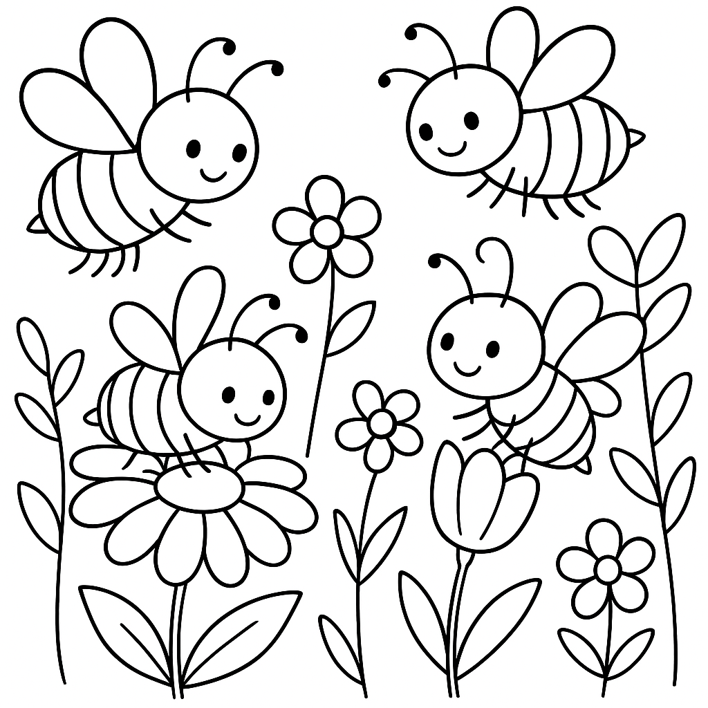 A simple coloring page featuring busy bees collecting pollen from spring flowers. Perfect for kids (4-6) with large, bold outlines for a fun coloring experience.