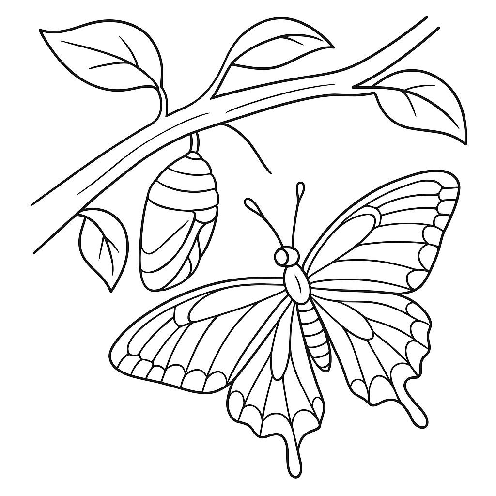 A medium coloring page featuring butterfly emerging from chrysalis on branch. Perfect for kids (6-9) with moderately detailed outlines for a fun coloring experience.
