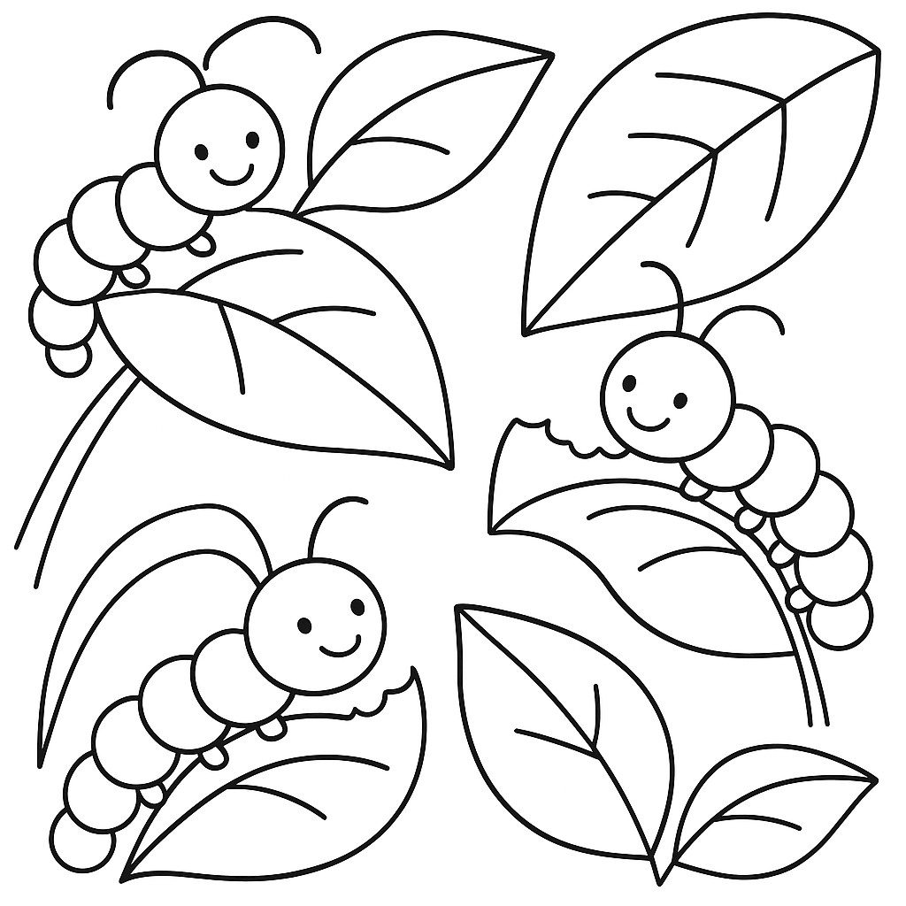 A simple coloring page featuring caterpillars munching on fresh spring leaves. Perfect for toddlers (2-4) with large, bold outlines for a fun coloring experience.