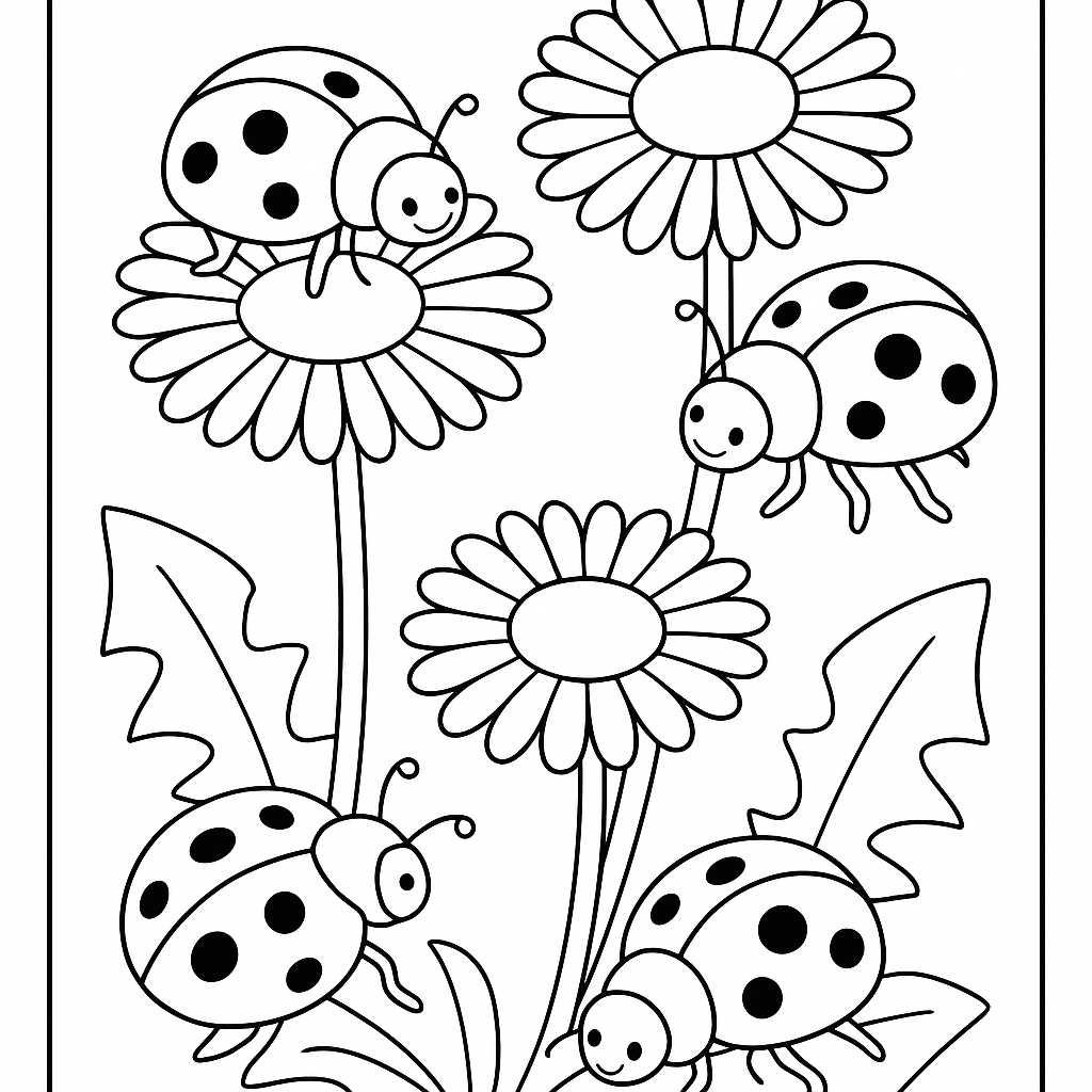 A simple coloring page featuring ladybugs crawling on dandelion flowers. Perfect for kids (4-6) with large, bold outlines for a fun coloring experience.