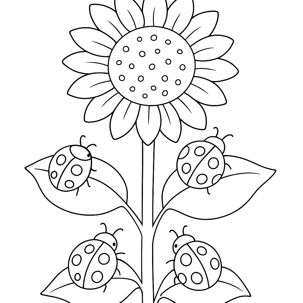 A simple coloring page featuring ladybugs gathering on a sunflower stem. Perfect for kids (4-6) with large, bold outlines for a fun coloring experience.