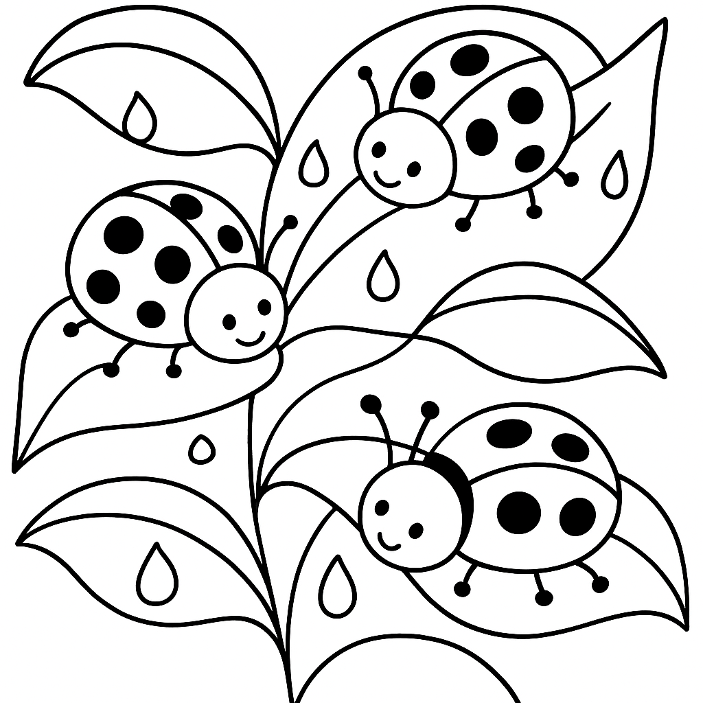 A simple coloring page featuring ladybugs on fresh green leaves with morning dew. Perfect for toddlers (2-4) with large, bold outlines for a fun coloring experience.