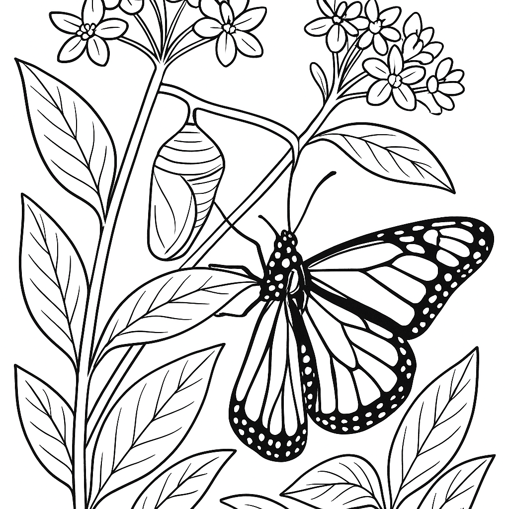 A detailed coloring page featuring monarch butterfly emerging from chrysalis on milkweed. Perfect for kids (6-9) with intricate detail for a fun coloring experience.