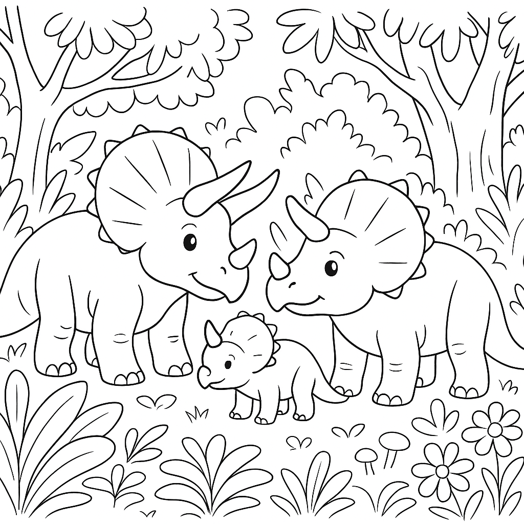 A medium coloring page featuring a gentle Triceratops family in a lush prehistoric spring forest. Perfect for kids (6-9) with moderately detailed outlines for a fun coloring experience.