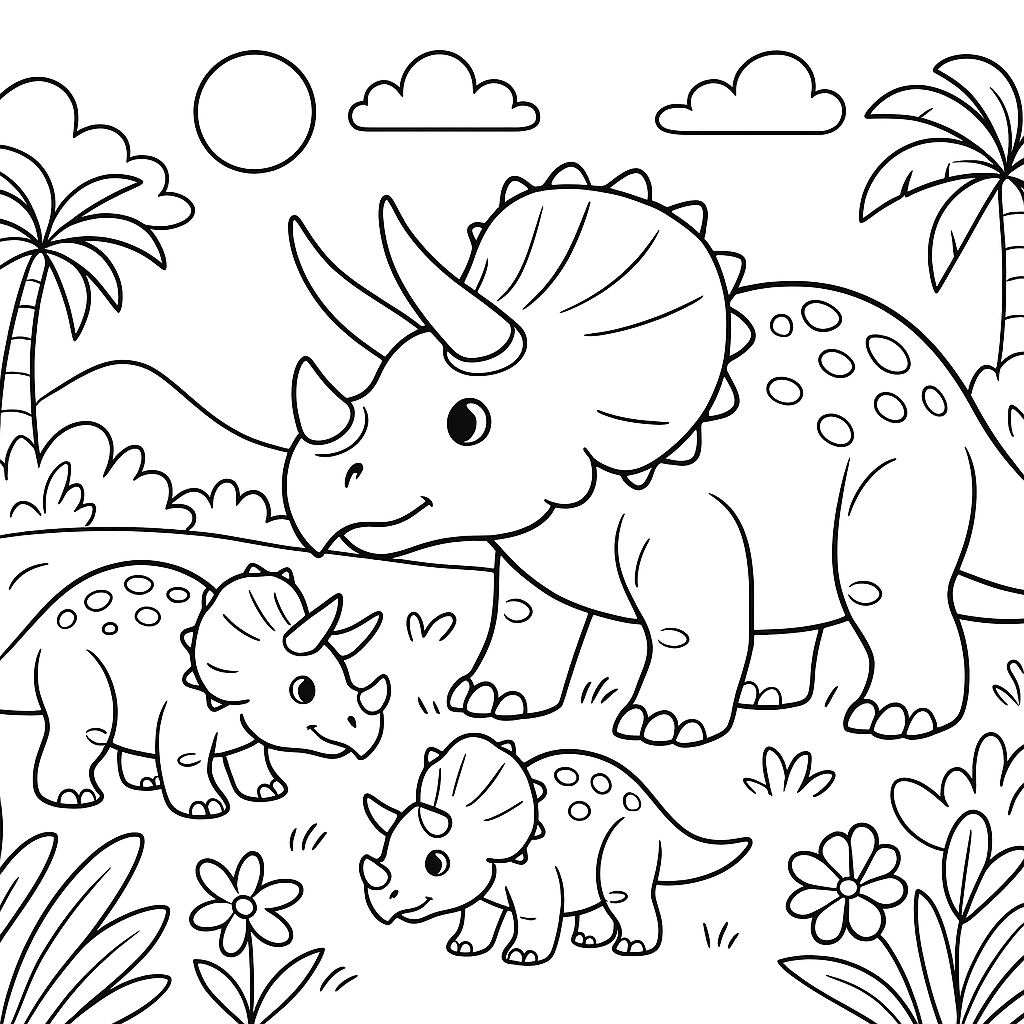 A medium coloring page featuring a Triceratops family in a prehistoric spring landscape. Perfect for kids (6-9) with moderately detailed outlines for a fun coloring experience.