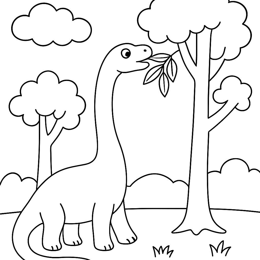 A simple coloring page featuring long-necked dinosaur eating from tall trees. Perfect for kids (4-6) with large, bold outlines for a fun coloring experience.