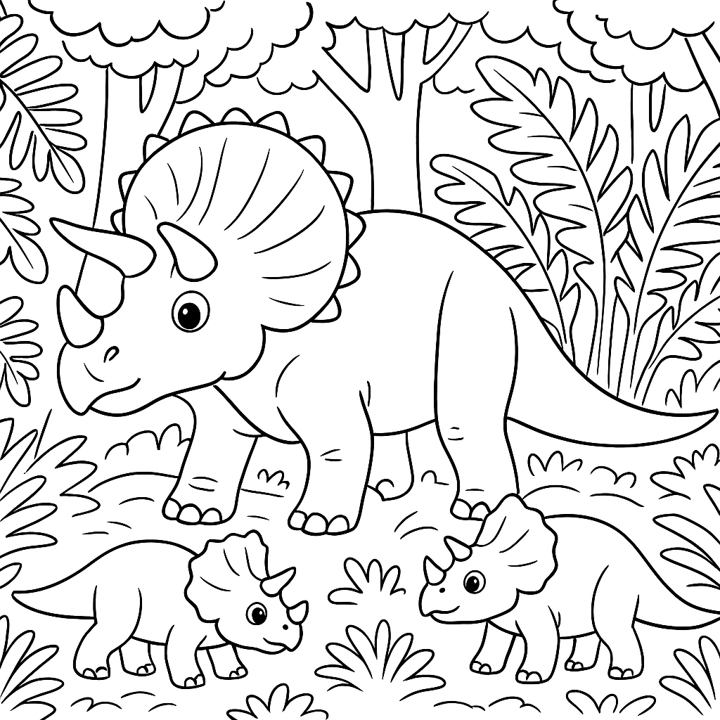 A medium coloring page featuring triceratops family in prehistoric forest with giant ferns. Perfect for kids (6-9) with moderately detailed outlines for a fun coloring experience.