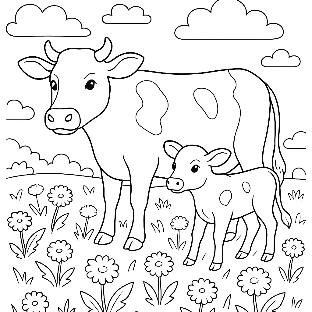 A medium coloring page featuring a cow and calf in a field of spring dandelions. Perfect for kids (6-9) with moderately detailed outlines for a fun coloring experience.