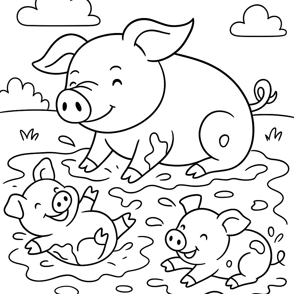 A simple coloring page featuring a mother pig with baby piglets rolling in mud. Perfect for kids (4-6) with large, bold outlines for a fun coloring experience.