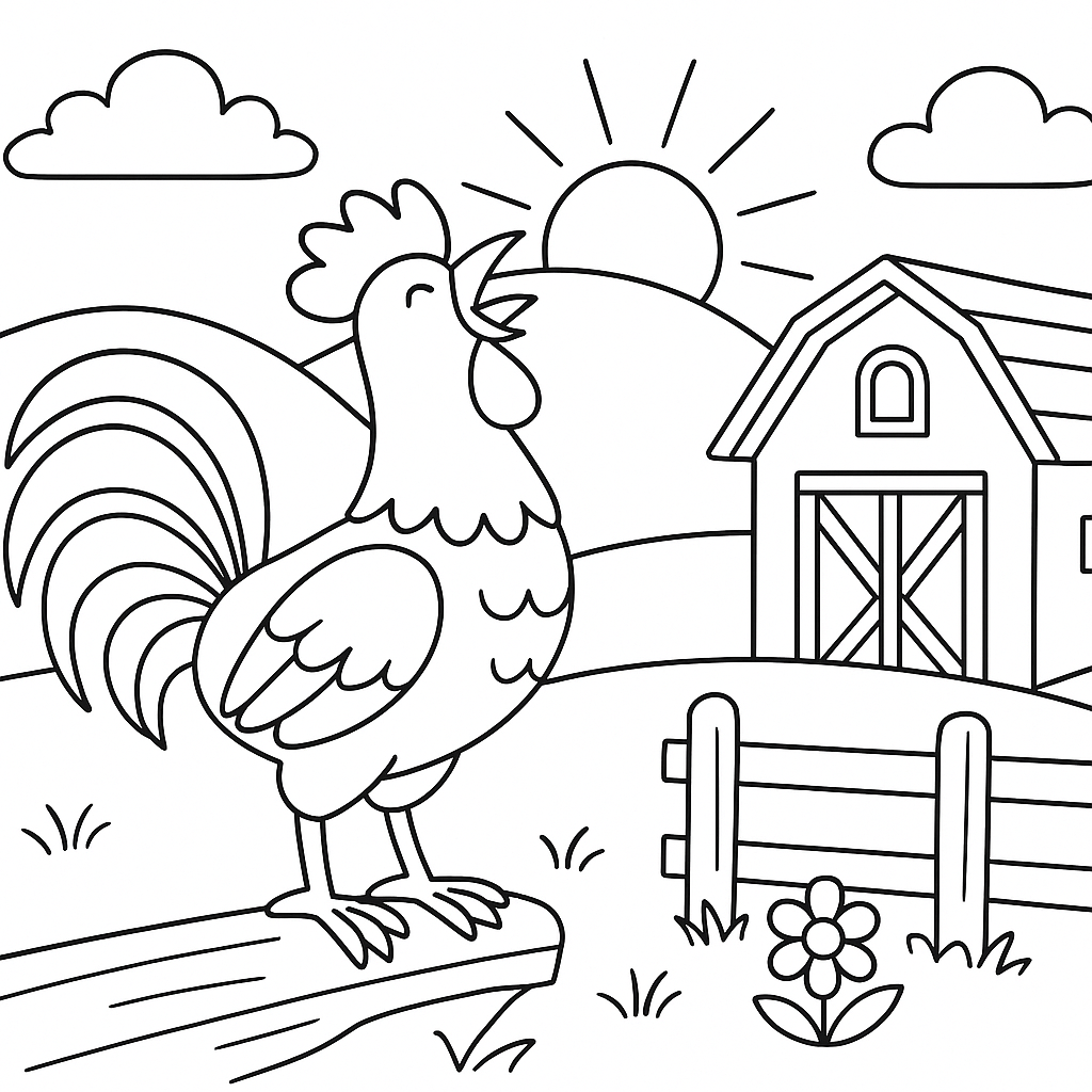A medium coloring page featuring a rooster crowing at sunrise in a barnyard. Perfect for kids (6-9) with moderately detailed outlines for a fun coloring experience.
