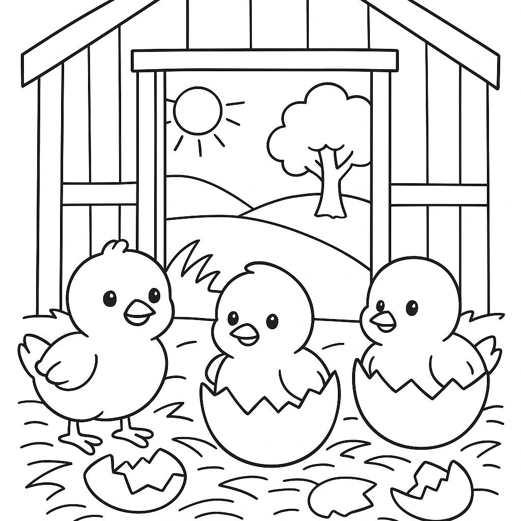 A simple coloring page featuring baby chicks hatching from eggs in a cozy nest. Perfect for toddlers (2-4) with large, bold outlines for a fun coloring experience.