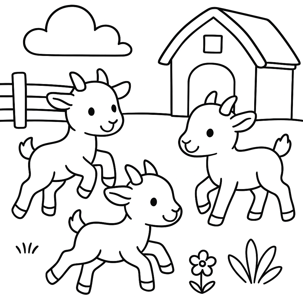 A simple coloring page featuring baby goat kids playing in farmyard. Perfect for toddlers (2-4) with large, bold outlines for a fun coloring experience.