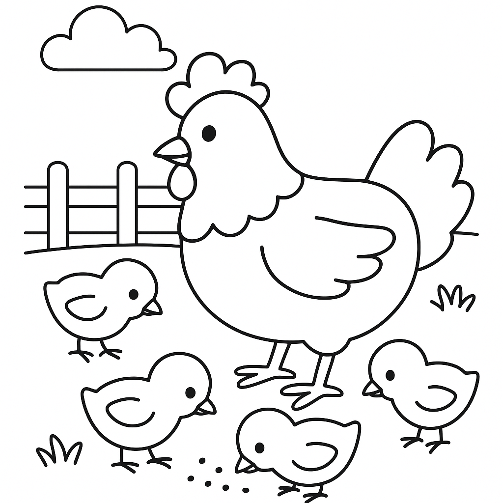 A simple coloring page featuring mother hen with chicks pecking in farmyard. Perfect for toddlers (2-4) with large, bold outlines for a fun coloring experience.