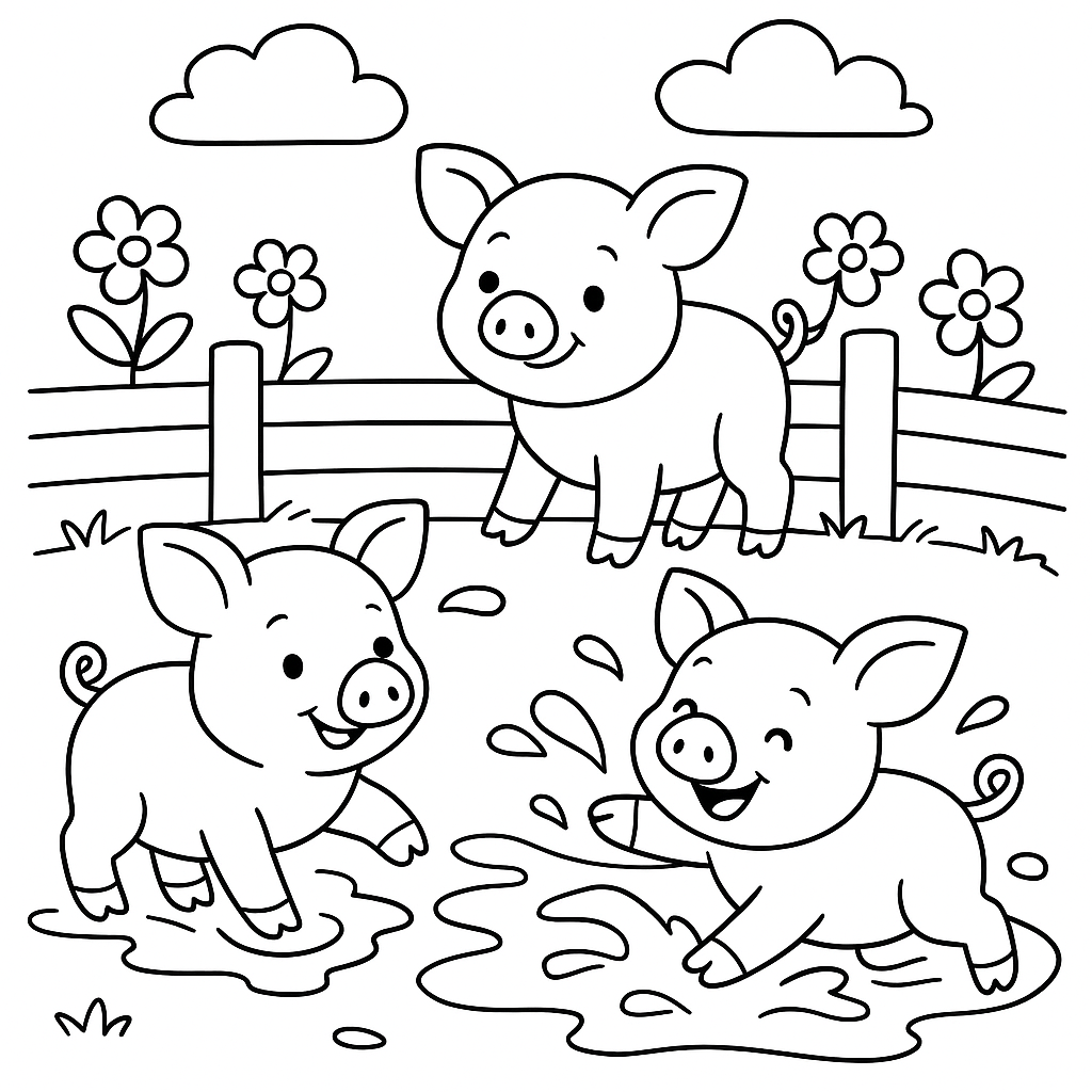 A simple coloring page featuring piglets playing in muddy spring pen. Perfect for kids (4-6) with large, bold outlines for a fun coloring experience.