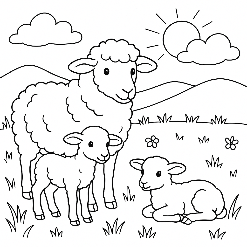 A medium coloring page featuring sheep with newborn lambs in pasture. Perfect for kids (6-9) with moderately detailed outlines for a fun coloring experience.
