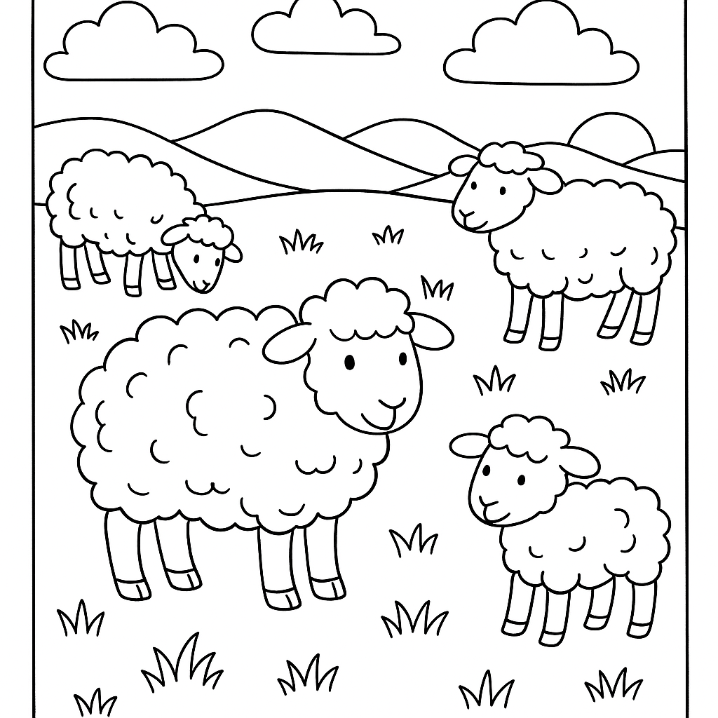 A medium coloring page featuring sheep with their wool coats in a green pasture. Perfect for kids (6-9) with moderately detailed outlines for a fun coloring experience.