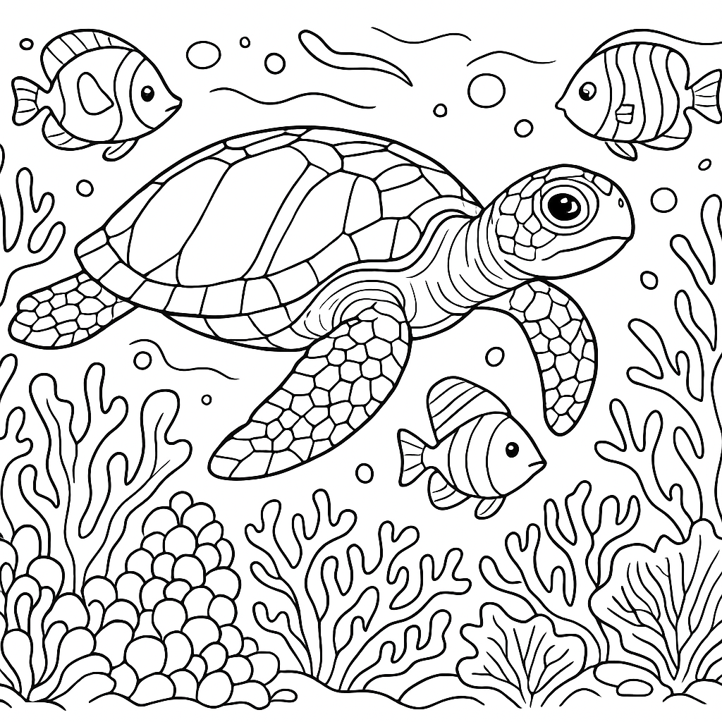 A detailed coloring page featuring a sea turtle swimming through a coral reef with tropical fish. Perfect for kids (6-9) with intricate detail for a fun coloring experience.