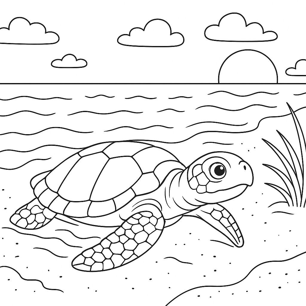 A medium coloring page featuring sea turtle returning to beach for nesting season. Perfect for kids (6-9) with moderately detailed outlines for a fun coloring experience.