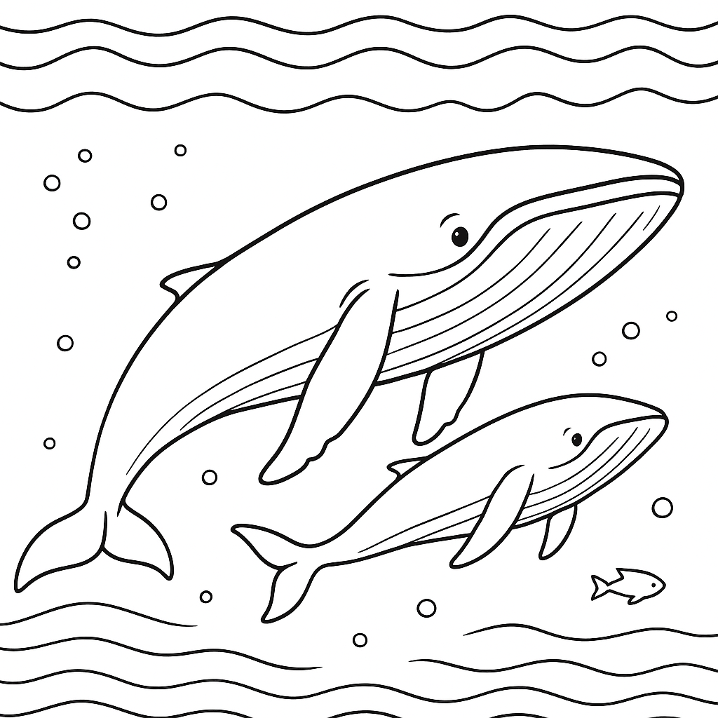 A medium coloring page featuring whale migration with mother and calf swimming together. Perfect for kids (6-9) with moderately detailed outlines for a fun coloring experience.